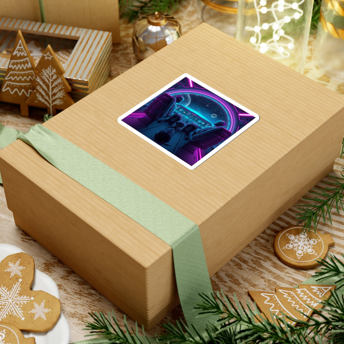 Drift through the quiet vastness of space with the Silent Orbit sticker, a striking neon sci-fi sticker featuring two futuristic astronauts navigating the stars alongside their loyal dog co-pilot. Bathed in glowing purple and blue cockpit lights, this scene captures a moment of calm, focus, and connection as distant planets float silently beyond the glass.